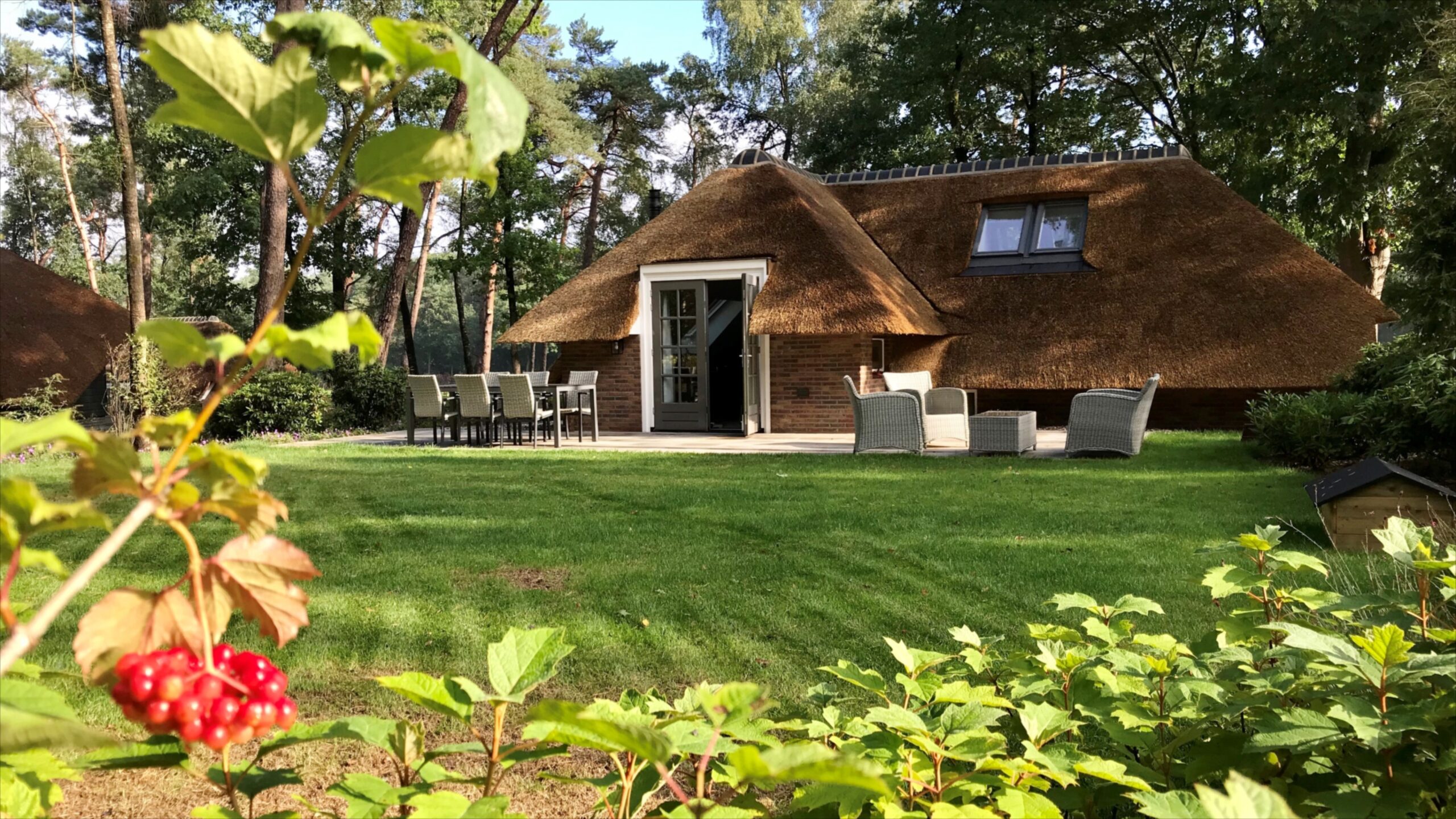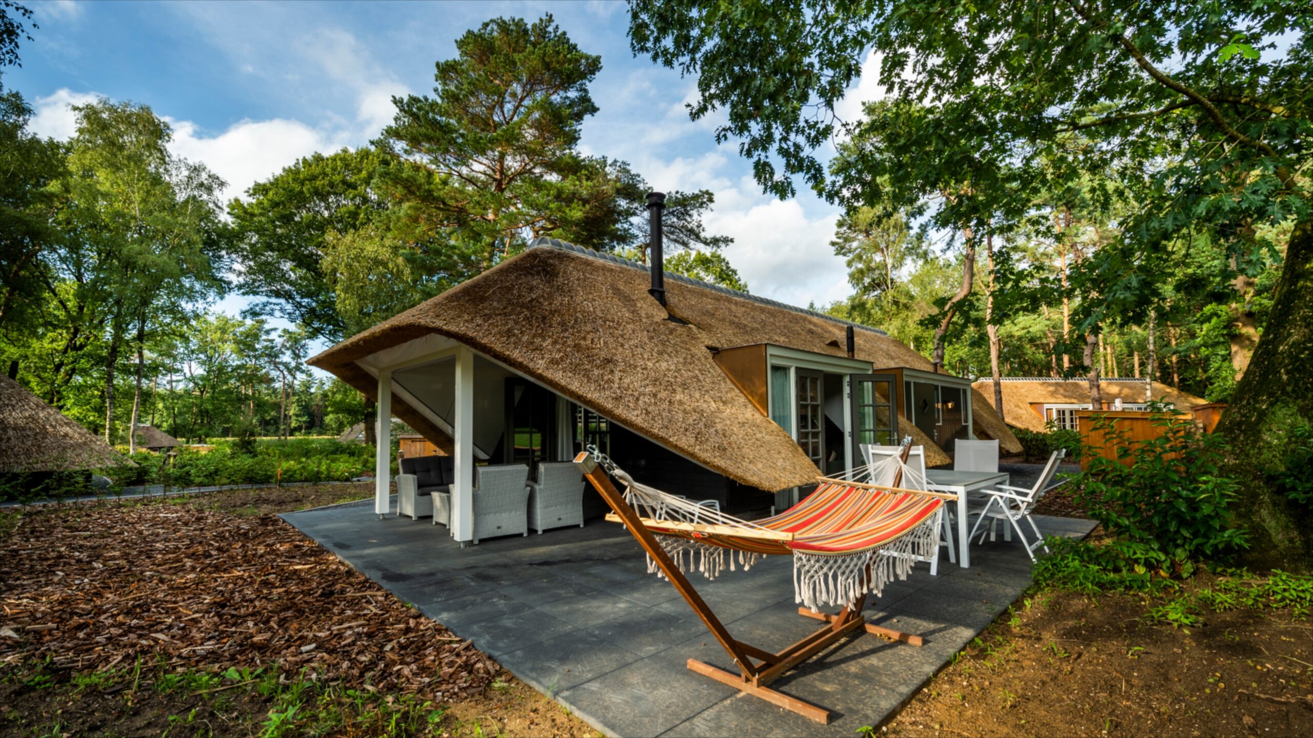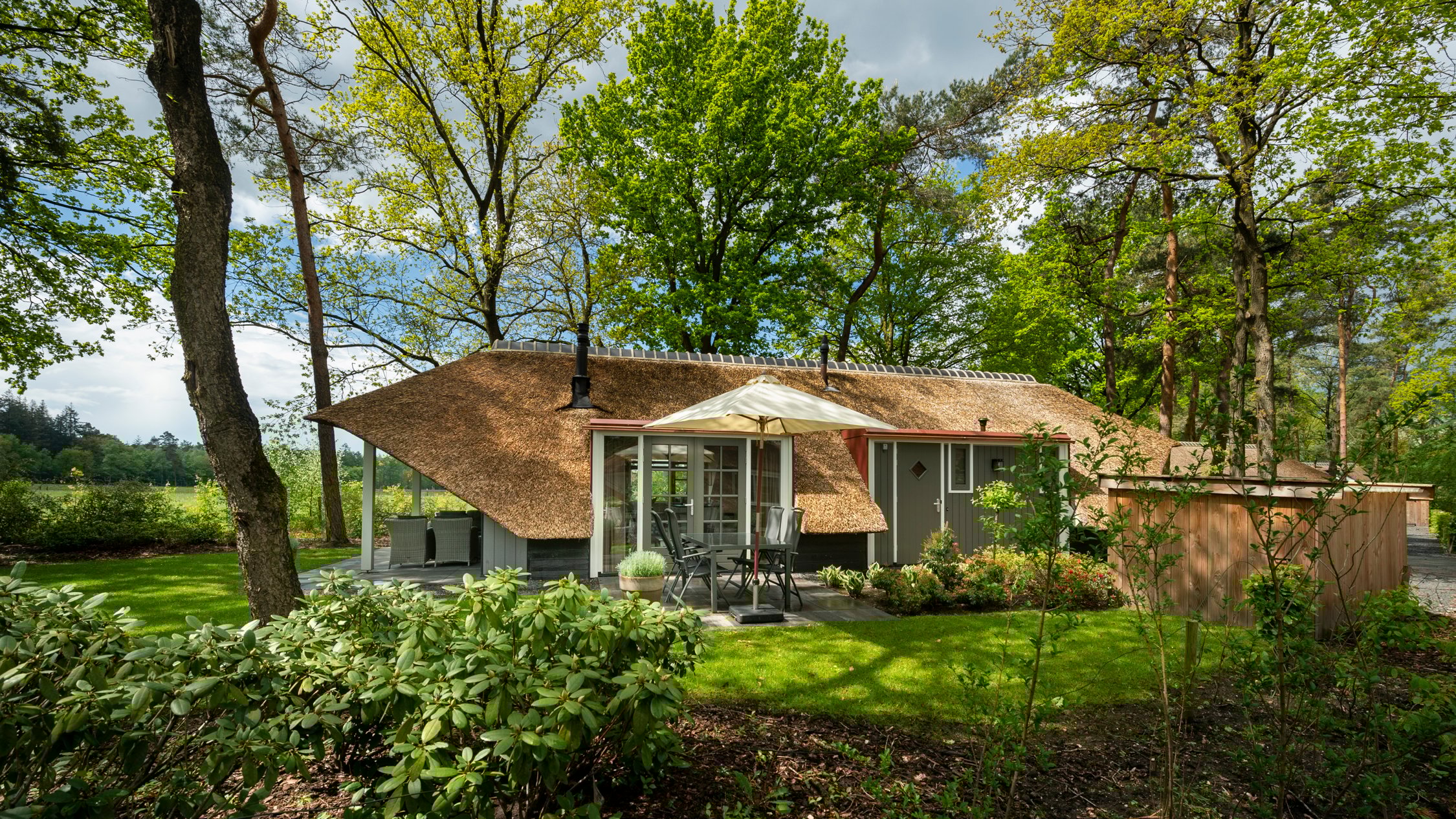 Lees meerOp een paar honderd meter van de bossen en heiden van de Veluwe staat deze leuke rietgedekte vakantiebungalow met besloten…
