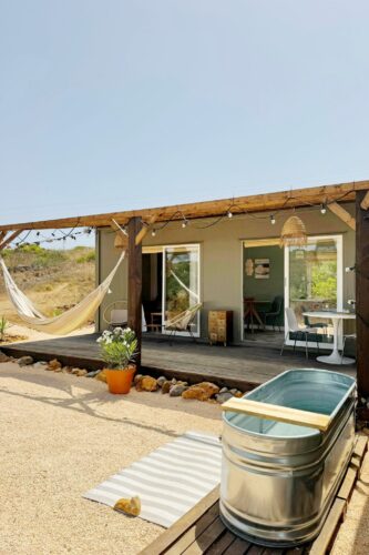 Tussen Lagos en Sagres, in een stille groene vallei, staat ons lichte en sfeervolle tiny house. Een plek om écht even te vertragen en te genieten van rust, ruimte en natuur. Het huisje heeft een aparte slaapkamer, een slaapbank voor twee personen, en een volledig uitgeruste keuken. Buiten vind je een heerlijke buitendouche en buitenbad, perfect om te ontspannen in de zon of onder de sterren.