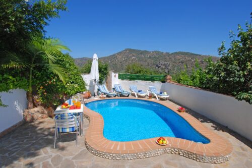 Dit prachtig gelegen landhuis biedt onze gasten een unieke vakantie-ervaring. Dit natuurhuisje biedt totale privacy, heeft een prachtig zwembad met waterval en diverse terrassen met BBQ en buitenoven. Omdat het weer het hele jaar door uitzonderlijk zacht is, kunt u vrijwel elke dag buiten koken of uw aperitiefje nuttigen. De terrassen bieden u de mogelijkheid om de hele dag door te genieten van zowel zon als schaduw. Er staan voldoende tuinmeubelen verspreid over verschillende zitjes. Het uitzicht op de Sierra Tejeda is werkelijk fenomenaal. het huis heeft een ruime woonkamer met een goed uitgeruste keuken. Naast de keuken is een berging met kast, wasmachine, strijkplank en strijkijzer. De lichte woonkamer heeft een gezellige zithoek. De slaapkamers geven uit op een balkon met spectaculair uitzicht op de bergen. De badkamer heeft een ruime douche, bidet en toilet. Alle ramen zijn voorzien van rolluiken en muggenhorren.