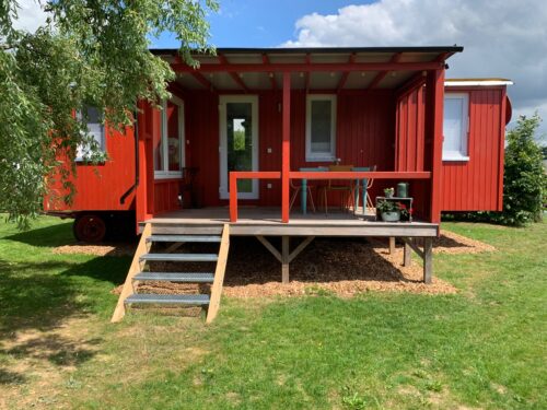 Prachtig tiny house voor twee personen in een fantastische omgeving. De ruimte van 26 m² is verdeeld in een keuken-woonkamer, apart slaapgedeelte met tweepersoonsbed (1,40×2 m) en badkamer. Er is infraroodverwarming in het woon- en slaapgedeelte. Het huis heeft een volledig uitgeruste kitchenette met twee keramische kookplaten, een oven, vaatwasser, waterkoker en Senseo pod apparaat. De woonkamer heeft een eettafel en een gezellige zithoek voor tv- of spelletjesavonden. De gast heeft WLAN toegang. De badkamer is uitgerust met een douche, toilet en wastafel, een haardroger en verwarming. De veranda voor het huis nodigt uit om te gaan zitten, of het nu voor het ontbijt is of om naar de zonsondergang te kijken. Het hele terrein, dat gebruikt mag worden, biedt op elk moment van de dag zon en schaduw! Er is een parkeerplaats voor de auto, meegebrachte fietsen kunnen worden gestald in de afsluitbare garage of fietsen kunnen worden gehuurd bij de verhuurder.