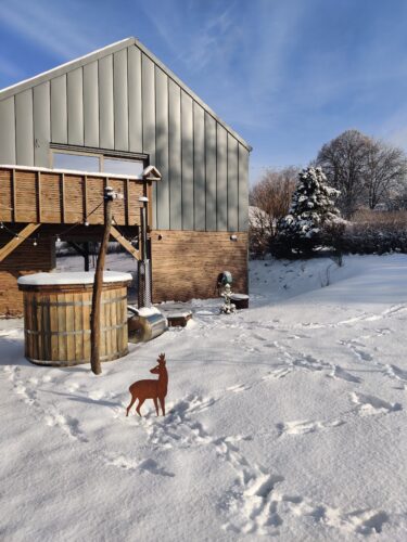Je gîte – ideaal voor 1 tot 4 personen – is nieuw en gebouwd met natuurlijke materialen (geraamte, binnen- en buitenbekleding van hout, isolatie van stro en klei). Het huis ligt op het zuiden om te profiteren van de warmte van de zon in de winter, terwijl het terras wordt beschermd tegen de zomerzon en oververhitting door een dak/terras dat is ontworpen om de rotatie van de zon te volgen. Het decor is een combinatie van de Alpen en de Ardennen: hout, vleugjes bos en de alomtegenwoordigheid van de Heer van onze Bossen. Je vindt het hert op een wandkleed, zijn gewei boven de open haard en in verschillende voorwerpen. Sommige muren zijn gemaakt van klei, terwijl andere zijn bekleed met planken van oude Oostenrijkse chalets en schuren. Je vindt hier alle zachtheid en schoonheid van natuurlijke, edele materialen, harmonieus gecombineerd in warme kleuren.