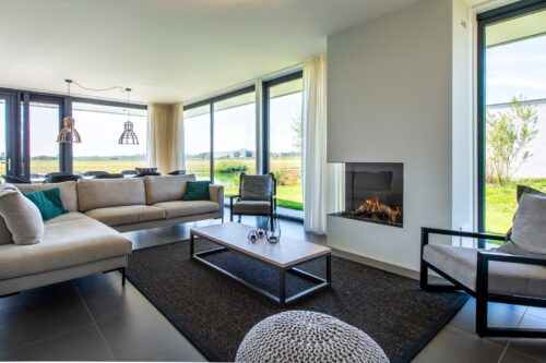 De sfeervolle woonkamer is heerlijk licht en door de volledig glazen pui over de volle breedte van de living (floor to ceiling windows) heeft u een panoramisch uitzicht over het weidse polderlandschap. Met de dubbele tuindeuren kunt u de woonkamer optimaal met de tuin verbinden. Naast een grote eettafel is er een royale zithoek met flatscreen TV met buitenlandpakket en een sfeervolle gashaard. De luxe, open keuken is volledig uitgerust met moderne kwaliteitsapparatuur, zoals een combi magnetron, vaatwasser en een Nespresso machine. Â