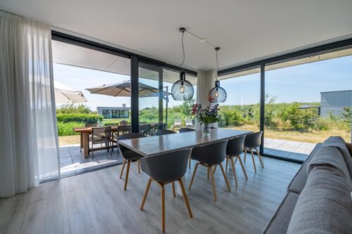 De sfeervolle woonkamer is heerlijk licht en door de glazen pui over de volle breedte van de living (floor to ceiling windows) kunt u genieten van de befaamde Zeeuwse luchten en zonsondergangen. Met de dubbele tuindeuren kunt u de woonkamer optimaal met de tuin verbinden. Naast een grote eettafel is er een royale zithoek met flatscreen TV met buitenlandpakket en een sfeervolle gashaard. De raampartijen zijn aan de buitenzijde voorzien van elektrisch bedienbare screens.